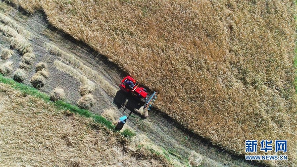 西藏日喀則市農(nóng)民在用農(nóng)機(jī)收割青稞(2018年9月13日攝)。 新華社記者 普布扎西 攝
