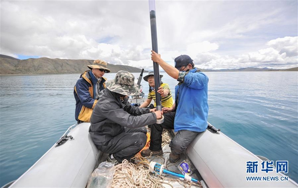 科學(xué)家對(duì)羊卓雍錯(cuò)全面測(cè)深(7月22日攝)。 新華社記者 晉美多吉攝