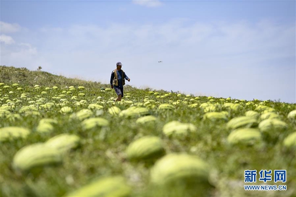 中寧縣喊叫水鄉喊叫水村的瓜農張平禮在瓜地里查看硒砂瓜的長勢(2019年7月23日攝)。 新華社記者 馮開華 攝