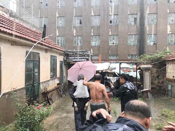 ??? 11日下午4時,乳山市城區街道夏東村,狂風呼嘯,大雨滂沱。風雨中,一人背著,一人撐傘,一位白發老人被轉移到安全地方安置……