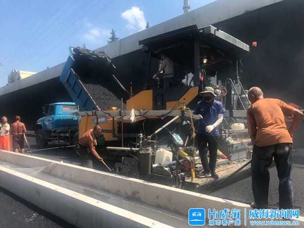 工人們正在攤鋪地下隧道瀝青面層。威海晚報記者 陳婷 攝