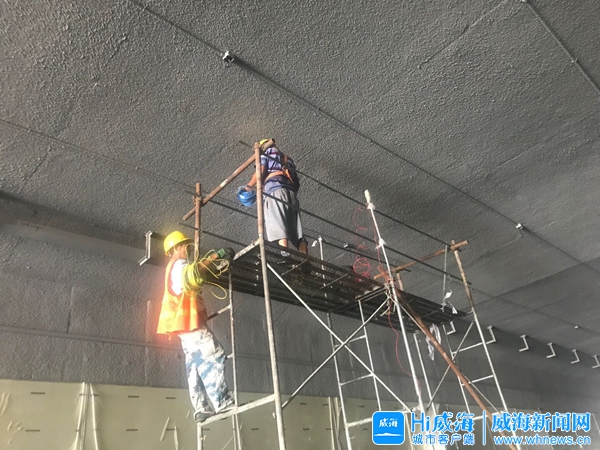工人們對隧道內部進行裝修。? 威海晚報記者 陳婷 攝