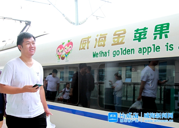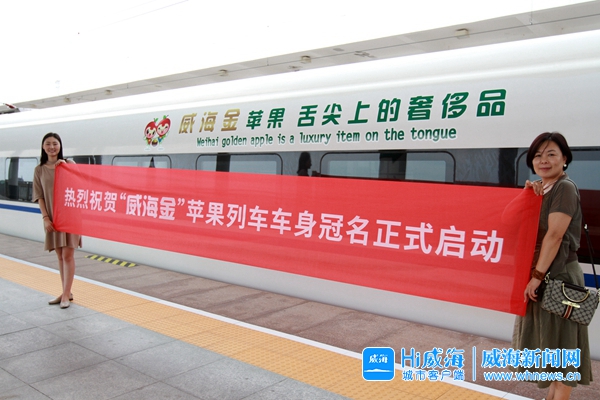 ????威海新聞網8月22日訊(記者 常會會)昨日11點6分,一輛從濟南發往榮成的“和諧號”列車平穩駛進榮成站站臺,這輛列車多節車廂的車身貼有威海農產及“威海金”蘋果的廣告語、標識,引來不少下車的乘客駐足觀看。昨日起,“威海金”蘋果正式冠名這列“和諧號”,它如同一張“移動名片”,載著威海農產及“威海金”蘋果的廣告語、標識駛向全國。