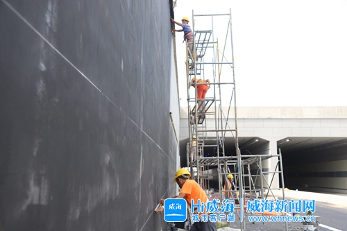 沿海濱南路韓樂坊東門一路向南,自大轉(zhuǎn)盤隧道敞口處,嶄新平坦的瀝青路面上,已經(jīng)畫好了標(biāo)線。道路中央,工人正在安裝路邊石。不遠(yuǎn)處,工人在腳手架上進(jìn)行隧道入口墻面的噴漆工作。隧道內(nèi),頂端的臨時(shí)照明設(shè)施已經(jīng)全部打開,兩側(cè)的鋼石板也已全部安裝完畢,輕輕敲擊,發(fā)出陣陣沉悶聲。