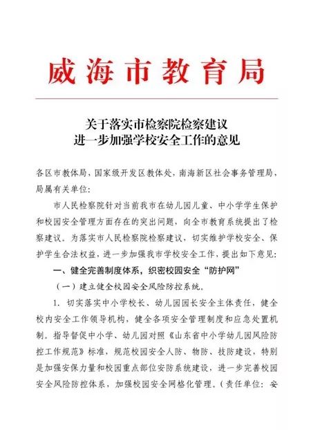 近日,威海市人民檢察院收到了來自當地教育局的《檢察建議》回復函?!百F院針對當前一些地方在幼兒園兒童、中小學學生保護和校園安全管理方面存在的突出問題,向我局發出檢察建議,充分體現了貴院和檢察系統對學校安全工作的高度關心……”回復中,市教育局從健全完善制度體系,加強法治教育,加強師德師風建設,厘清責任、狠抓落實四大方面給予整改意見。