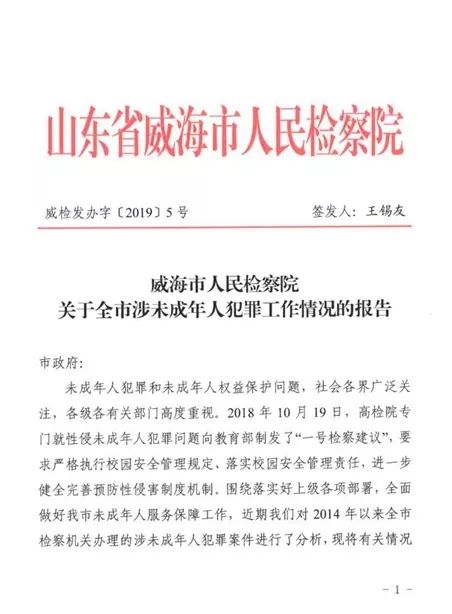 《報告》中分析了2014年以來威海全市檢察機關辦理的涉未成年人犯罪案件的相關情況,以及案件反映出的社會治理問題。“2014—2018年,全市共起訴未成年人犯罪案件193件248人,起訴侵害未成年人案件151件171人”,“在校生犯罪呈現上升趨勢,未成年被告人是學生身份的共有46人,占總人數的18.5%。”、“2014年以來共辦理強奸、猥褻等性侵未成年人犯罪案件57件60人”……一條條數據令人震驚又揪心。
