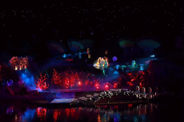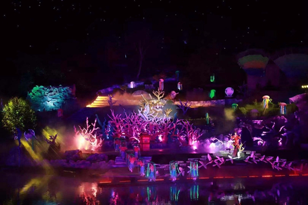 ????為增加景區文化內涵,2010年,華夏文旅集團在礦坑中打造了會跑的實景演藝《神游華夏》秀,利用采石場地貌,因地制宜,變廢為寶,將會跑的移動式看臺觀眾席設在大型采石場上,在山體修復中順勢打造自然山水實景舞臺,借用采石場北側矗立的山體斷面就勢修建 “之”字舞臺,依托陡峭山勢打造“黃河之水天上來”的壯觀景象。《神游華夏》演藝以獨特的演出形式和觀看模式,讓觀眾坐不離席就可以欣賞到水、陸、空全方位立體環繞的跨時空精彩演藝,開啟膠東半島夜間文化生活美妙之旅。