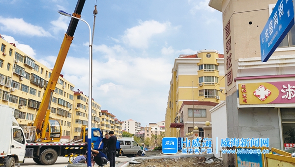 工作人員正在安裝路燈。 記者 王曉 攝