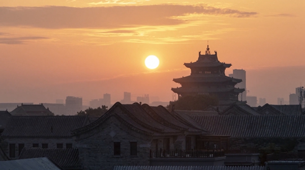 聊城市東昌府古城日出。