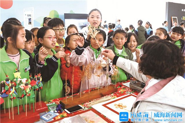 文化展館里人流絡繹不絕,無論老少都驚嘆于傳統藝術的魅力。來自榮成市實驗中學的初一學生王波敏表示:“我很喜歡剪紙,傳統藝術一定會經久不衰,不斷傳承下去!”