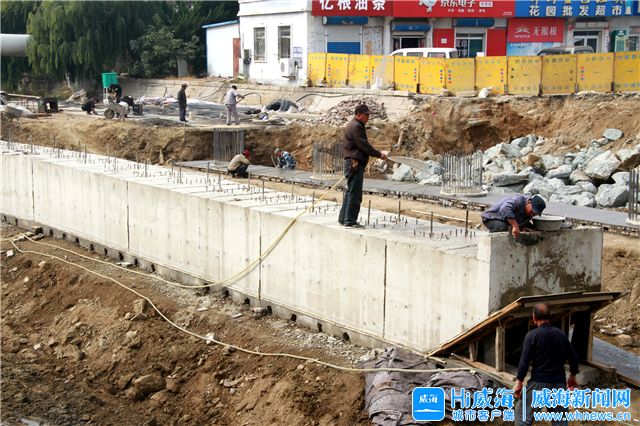 10月22日10時許,記者在位于初村鎮山海路上的駕前橋施工現場看到,施工車輛往來穿梭,忙著運送橋底土方,施工工人忙著捆扎鋼筋。