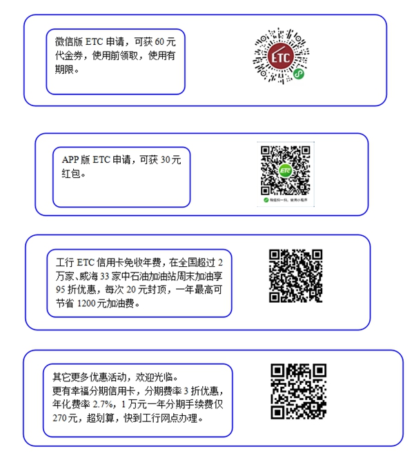 ????尊敬的客戶,您還沒有辦理ETC嗎?高速通行改造接近尾聲,市內ETC停車場已列入計劃,歡迎您抓緊到工行免費辦理、9折通行,另送燙手大禮包!詳詢:5231610