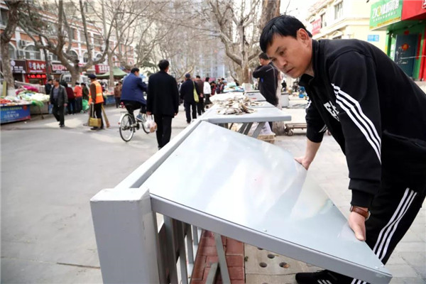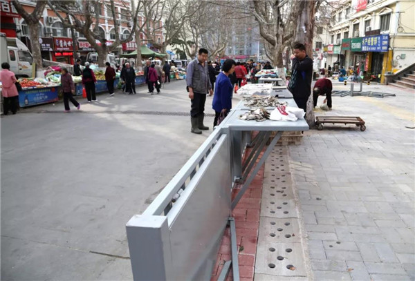 另一大整治“法寶”是旁邊“暗藏玄機”的貨架。將鋼板向上一抬,支撐架收起,貨架柜面就收縮折疊起來,整個貨架眨眼就“縮”成了一座路邊圍欄,道路變得更加開闊。