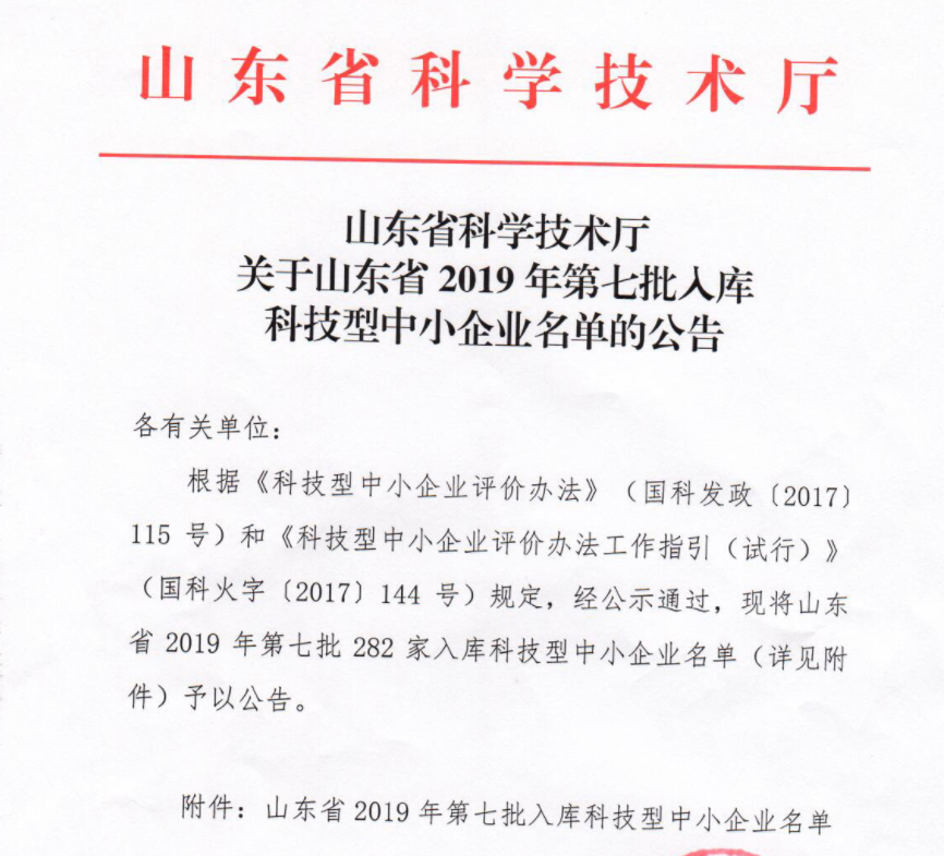 近日,山東省2019年第七批282家入庫科技型中小企業名單公布,其中,我市12家企業入選。