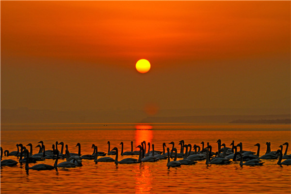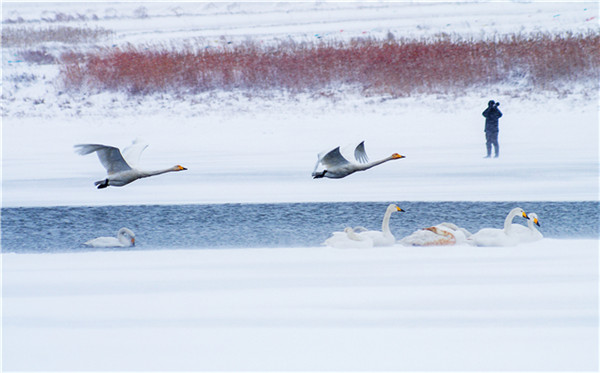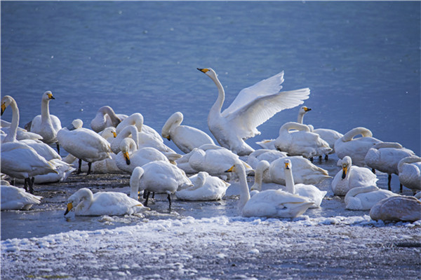 在如此漫長的遷徙中,它們要在高山雪嶺中抵御嚴(yán)寒,在風(fēng)雷雨電中奮勇飛翔,在冰天雪地中尋找食物,在蒼茫的天際中確定航向……這是怎樣堅韌的毅力和信念,才能讓這群“凌波仙子”不畏艱辛數(shù)月飛行。而又是什么樣的天賜福地,讓大天鵝千里跋涉只為來此越冬?