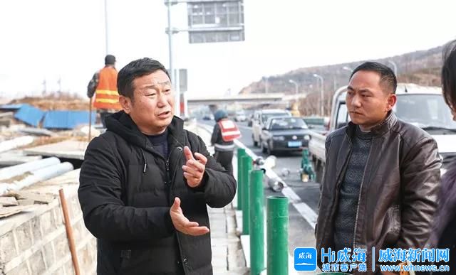 孫志嵩在環山路上和工人進行溝通了解進展。Hi威海客戶端記者 孫大偉 攝