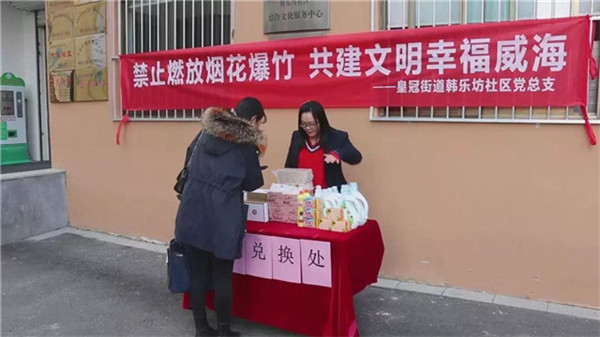 2020年是威海城區(qū)禁止燃放煙花爆竹的第二年,臨近年關(guān),韓樂坊社區(qū)積極行動(dòng)組織開展了鞭炮兌換生活用品活動(dòng),居民全年都可以將家里的煙花爆竹拿來(lái)社區(qū)兌換成紙抽、毛巾、洗衣液、清潔劑、肥皂等生活日用品,以避免家中存放煙花爆竹帶來(lái)安全隱患。同時(shí)倡議大家積極參與禁放行動(dòng),共建文明幸福威海。
