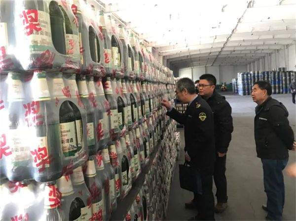 執(zhí)法人員現(xiàn)場檢查了企業(yè)原輔料進貨查驗、酒瓶清洗和殺菌、出廠檢驗等過程。