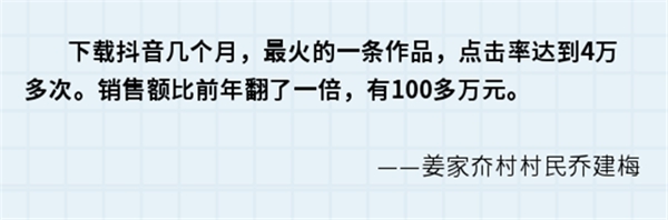????去年9月,喬建梅注冊(cè)“乳山市山寶山貨批發(fā)部”抖音賬號(hào),試探著發(fā)了第一條原創(chuàng)視頻,不一會(huì)兒就賺來(lái)1000多條點(diǎn)擊量,她一下子來(lái)了勁兒。當(dāng)天,她又發(fā)出第二條原創(chuàng)視頻,點(diǎn)擊量更多了。