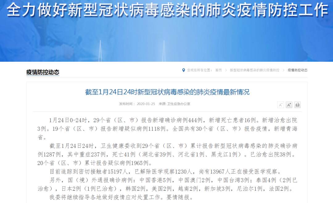 ????截至1月24日24時(shí),衛(wèi)生健康委收到29個(gè)省(區(qū)、市)累計(jì)報(bào)告新型冠狀病毒感染的肺炎確診病例1287例,其中重癥237例,死亡41例(湖北省39例、河北省1例、黑龍江1例)。已治愈出院38例。20個(gè)省(區(qū)、市)累計(jì)報(bào)告疑似病例1965例。