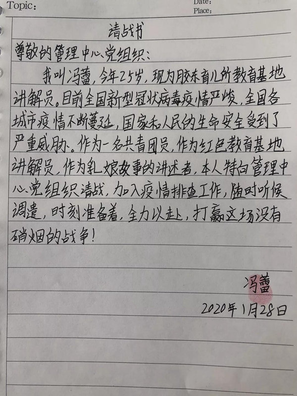 ????馮蕾,是威海馬石山教育基地管理中心的一名講解員。2020年1月28日,她給管理中心黨組織遞交了一份“請戰書”。