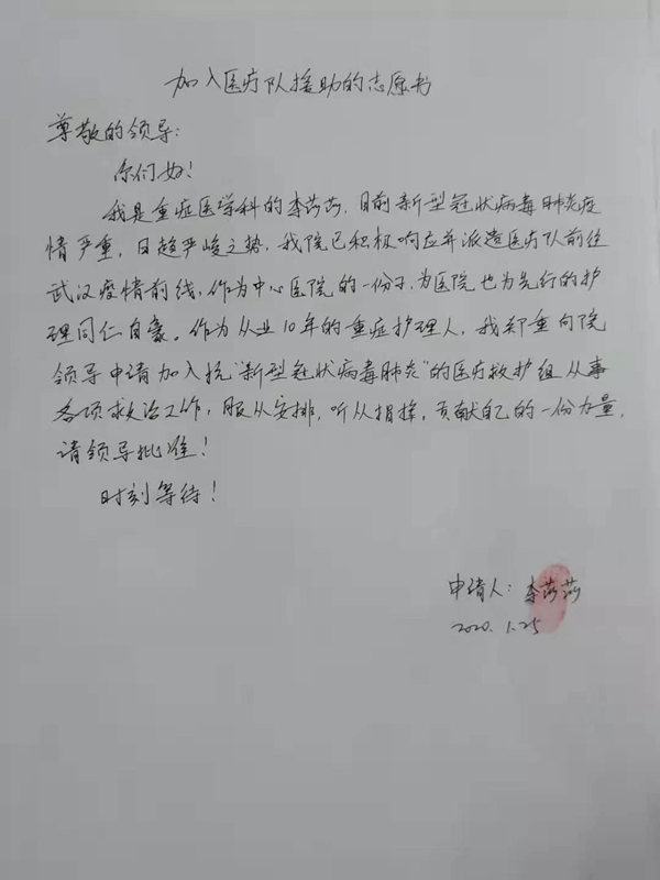 ????作為在重癥醫學科工作十年的護士,李莎莎一直密切關注著這場疫情,她也明白自己的使命,“一旦情況需要,我必須沖上去!”。之前,她就報名參加首批援助湖北醫療隊,并提交了請愿書。“其實疫情爆發的時候我就有心理準備,沒想到這么快。”李莎莎說道。