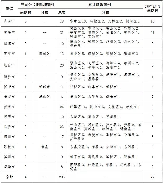??????2020年2月1日0—12時,山東省報告新型冠狀病毒感染的肺炎新增確診病例4例,現有疑似病例77例,累計確診病例206例(含重癥病例12例,危重癥病例1例,出院3例,無死亡病例)。目前,累計追蹤到密切接觸者6389人,已解除醫學觀察915人,診斷為疑似或確診74例,尚有5400人正在接受醫學觀察。