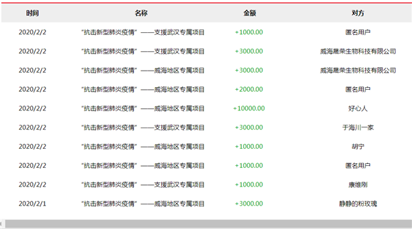 新型冠狀病毒感染的肺炎疫情牽動著所有威海人的心。從1月27日開始,威海廣大市民就踴躍捐贈,為打贏疫情防控阻擊戰貢獻自己的一份力量、一份愛心。威海市慈善總會統計顯示:截至2月3日15時,個人捐贈額達到1000元(含)以上的就有63筆,捐款幾元到幾百元的大約有五六百筆。還有部分市民捐贈時沒有留下名和姓,但不管是真實姓名捐贈還是匿名捐贈者,他們都擁有一個共同的名字:愛心人士!