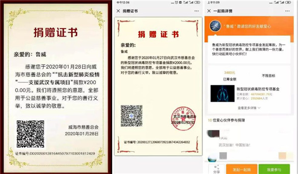 市民魯威,中共黨員,家住經區富興小區。湖北新冠病毒感染的肺炎疫情發生后,魯威第一時間向武漢市慈善總會捐款2460元,助力當地疫情防控。同時,聯系微信朋友圈里的朋友,發起支援武漢專屬項目的公益募捐活動,現已募集款項2820元。隨后,他又向山東省紅十字會捐款210元。