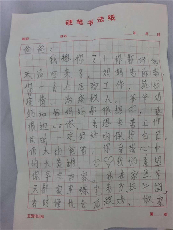 “爸爸:我想你了!你都好多天沒回來了。媽媽告訴我,你一直在醫院工作,抗戰疫情、治病救人。爺爺奶奶和我媽媽都很想你,也很擔心你。希望辛苦工作的同時一定好好的保護自己。偉大的爸爸,你是我心中的大英雄,我們希望你早點回家。我在家里每天都練字、看書、拉二胡,有時候也會玩游戲、做家務,我們馬上要開始網上學習課程了,是學校老師整的,我在家里會好好學習聽話的?!?/p>
