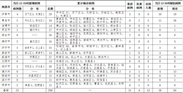 ??????2020年2月4日12—24時,山東省報告新型冠狀病毒感染的肺炎新增確診病例23例,累計確診病例298例(含重癥病例21例,危重癥病例4例,出院13例,無死亡病例);新增疑似病例38例,現有疑似病例94例。截至目前,追蹤到密切接觸者10264人,已解除醫學觀察4058人,診斷為疑似或確診139例,尚有6067人正在接受醫學觀察。