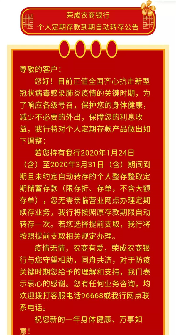 系統“給力”,自動轉存到期定期存款。考慮到部分存款到期客戶的利益,對個人定期存款產品做出調整,凡2020年1月24日(含)至2020年3月31日(含)期間到期且未約定自動轉存的個人整存整取定期儲蓄存款,系統按照原存款期限自動轉存1次,減少客戶不必要的外出,有效保障了特殊時期客戶的利息收益。