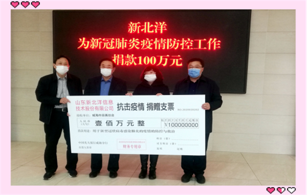 2月2日,山東新北洋信息技術股份有限公司向威海市慈善總會捐款100萬元,為打贏疫情防控阻擊戰貢獻力量。