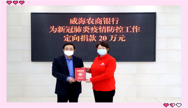2月4日,威海農村商業銀行定向捐贈20萬元,緩解抗擊疫情前線物資短缺的燃眉之急。
