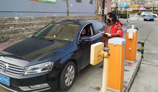 ??????在海韻社區的臨時卡點,志愿者戚軍峰正檢查過往人員和車輛,從大年初四開始,每天早晨6點到晚上10點,戚軍峰和其他志愿者們輪流執勤,檢查登記,測量體溫,宣傳防疫常識。