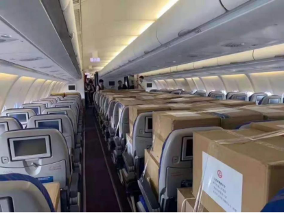 這是肯尼亞華裔內(nèi)羅畢飛往廣州的一個(gè)普通商業(yè)航班,但整個(gè)飛機(jī)上沒有人,而是整齊的放滿一箱箱的醫(yī)用口罩,被人們稱為“口罩專運(yùn)”的航班。