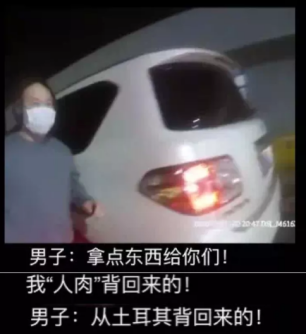 在南京公安檢查站,一輛白色轎車突然停在路邊,一男子戴著口罩從車上下來,一邊從車上搬箱子,一邊對民警說:“拿點(diǎn)東西給你們!我從土耳其‘人肉’背回來的。”