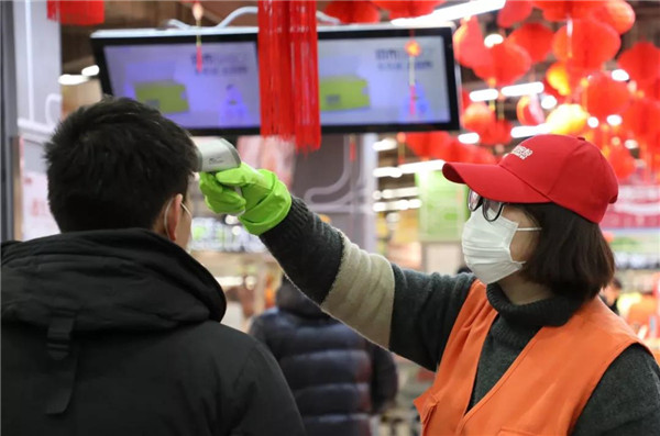 2月12日,走進家家悅超市中心店,在入口處,兩名家家悅員工使用遠紅外體溫測量儀為顧客測量體溫,符合正常標準后予以放行。
