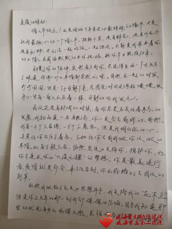 ??????在國家民族大義面前你的選擇是對的,我支持你,做你堅強的后盾,照顧好兒子,照顧好家里,免除后顧之憂。這里還有你的醫院、威海衛健委和那些關心你的人的幫助,請安心工作,把思念化作動力,在武漢能努力工作,發揮出黨員的先鋒模范作用,以身作則,沖鋒在前,恪盡職守,奮力奪取疫情防控殲滅戰的全面勝利。你是我們的榜樣,我們為你感到驕傲。只希望你在那里可以保護好自己,早日戰勝病毒,家人盼歸。