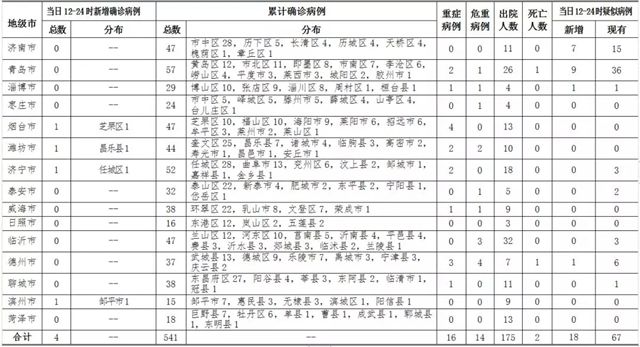 ??????2020年2月16日12-24時,山東省報告新增新型冠狀病毒肺炎確診病例4例,累計確診病例541例(含重癥病例16例,危重癥病例14例,治愈出院175例,死亡病例2例);新增疑似病例18例,現有疑似病例67例。截至目前,追蹤到密切接觸者15756人,已解除醫學觀察12204人,診斷為疑似或確診病例289例,尚有3263人正在接受醫學觀察。