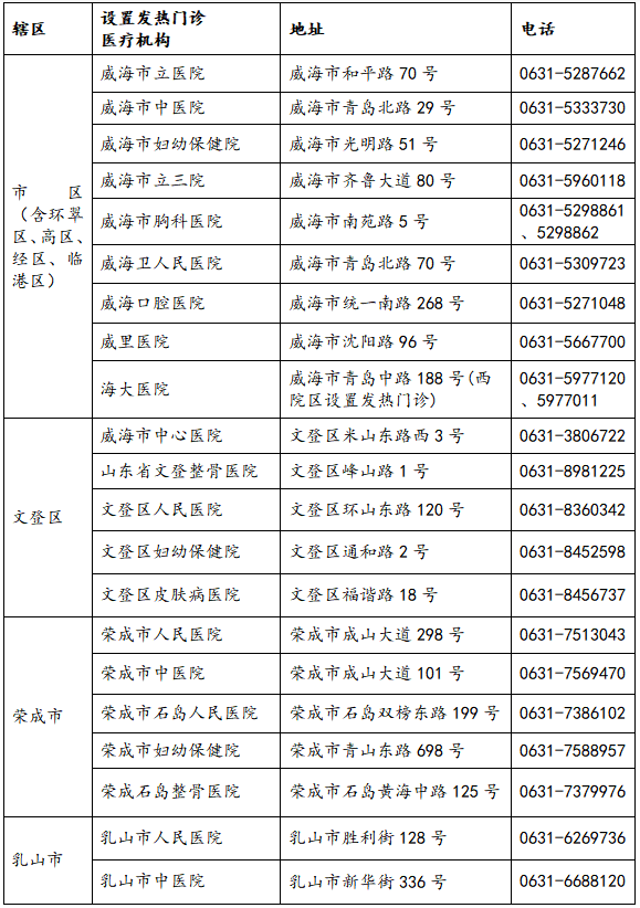 ??????威海市開設發熱門診的二級以上醫療機構名單?