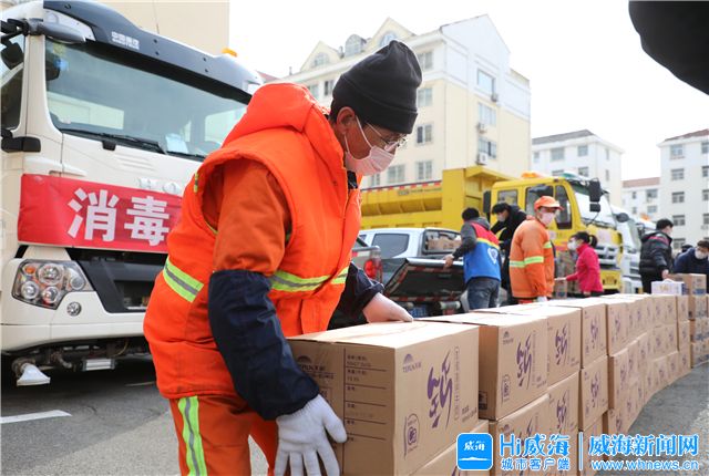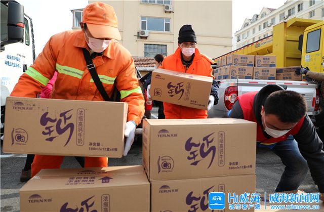 ??????2月24日,威海市建設咨詢服務業協會三家會員單位,向環翠區環衛工人捐贈200箱奶、200袋大米和200箱雞蛋,感謝他們的辛勤堅守。(Hi威海客戶端記者 王曉/圖)
