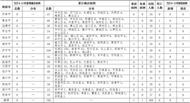 ??????2020年2月26日0-12時,山東省無新增新型冠狀病毒肺炎確診病例,累計確診病例756例(含重癥病例7例,危重癥病例7例,治愈出院368例,死亡病例6例);無新增疑似病例,現有疑似病例2例。截至目前,追蹤到密切接觸者16757人,已解除醫學觀察15304人,診斷為疑似或確診病例291例,尚有1162人正在接受醫學觀察。