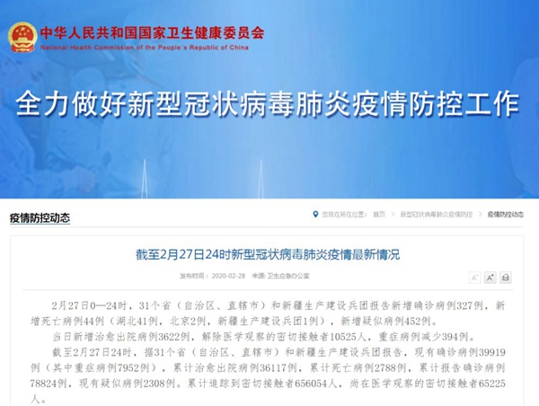 ??????2月27日0—24時(shí),31個(gè)省(自治區(qū)、直轄市)和新疆生產(chǎn)建設(shè)兵團(tuán)報(bào)告新增確診病例327例,新增死亡病例44例(湖北41例,北京2例,新疆生產(chǎn)建設(shè)兵團(tuán)1例),新增疑似病例452例。