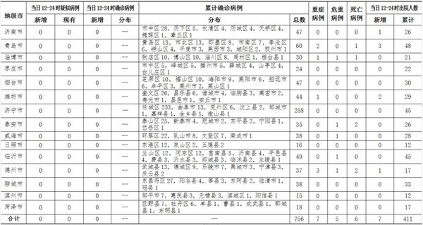 ??????2020年2月28日12-24時,山東省無新冠肺炎疑似病例;無新增確診病例,累計確診病例756例(其中,重癥病例7例,危重癥病例5例,死亡病例6例);新增治愈出院7例,累計治愈出院411例。截至目前,追蹤到密切接觸者16843人,已解除醫學觀察15714人,診斷為疑似或確診病例291例,尚有838人正在接受醫學觀察。