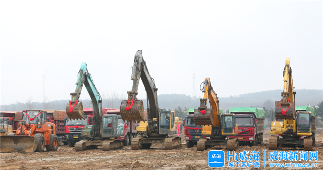 ??????當天,在威建建邦新型建筑材料生產基地項目建設施工現場,口罩、消毒液等防疫物資整齊地擺放在入口處,隨著一聲開工令下,數十臺挖掘機、土方車動了起來,吊臂起落、車輛穿梭、機器轟鳴,工人們戴著口罩忙活起來,現場一派熱火朝天的景象。