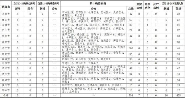 2020年3月1日12-24時,山東省無新冠肺炎疑似病例;無新增確診病例,累計確診病例758例(其中,重癥病例7例,危重癥病例2例,死亡病例6例);新增治愈出院16例,累計治愈出院455例。截至目前,追蹤到密切接觸者16902人,尚有581人正在接受醫(yī)學觀察。