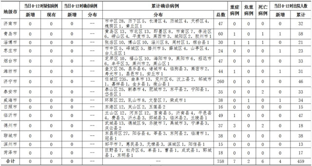 ??????2020年3月2日0-12時,山東省無新冠肺炎疑似病例;無新增確診病例,累計確診病例758例(其中,重癥病例7例,危重癥病例2例,死亡病例6例);新增治愈出院4例,累計治愈出院459例。截至目前,追蹤到密切接觸者16909人,尚有544人正在接受醫學觀察。