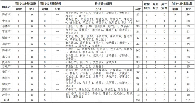 ??????2020年3月4日0-12時,山東省無新冠肺炎疑似病例;無新增確診病例,累計確診病例758例(其中,重癥病例6例,危重癥病例2例,死亡病例6例);新增治愈出院4例,累計治愈出院515例。截至目前,追蹤到密切接觸者16971人,尚有475人正在接受醫學觀察。