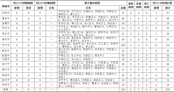 ??????2020年3月4日12-24時,山東省無新冠肺炎疑似病例;無新增確診病例,累計確診病例758例(其中,重癥病例5例,危重癥病例2例,死亡病例6例);新增治愈出院61例,累計治愈出院576例。截至目前,追蹤到密切接觸者16977人,尚有435人正在接受醫學觀察。